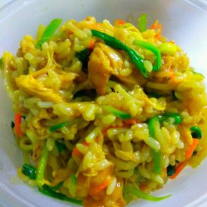 开始拌饭,,,一勺卤鸡腿汤,,一勺拌饭汁,一碗米饭,所有蔬菜