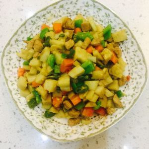加入莲菜,胡萝卜,我又加了一点水,盖盖炒了两分钟