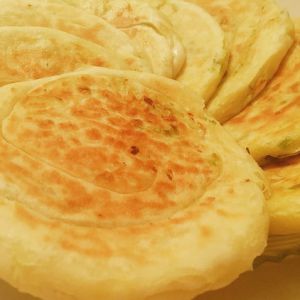 等第十个饼坯做好,第一个也已经饧发好了,电饼铛预热好,中火设置五分钟,把饼坯用手轻轻压成约5mm厚的饼,放入电饼铛~经过二次饧发,面已经足够柔软~如果开始发面的时候面团不够软不够光滑,延展性差,这一步饼坯就容易破漏葱漏油酥~