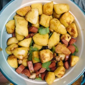 利用国内余油,炒配料,放盐和孜然粉调味。炒熟以后倒入馒头丁继续翻炒,然后出锅。