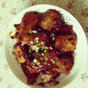 在煎的同时,将生抽、醋、糖、料酒调成汁,待用。