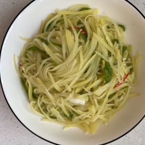 翻炒两分钟后,倒入辣椒丝,继续翻炒约一分钟就能出锅了。