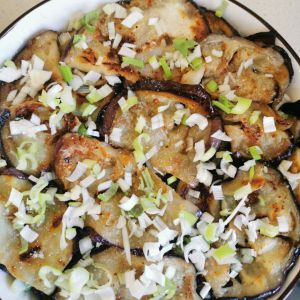 煎熟了放盘中平铺好了,一层茄子,一层盐,一小把葱花,这样逐一的铺下去。