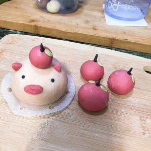 面团分开!3个90克小面团(小熊,小鸭子,小兔子),4个十克小面团。110克(小猪)65克(橘子),一个3克小面团,两个个1克小面团!