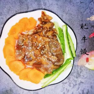 米饭铺底,依次摆上焯水后的胡萝卜,肥牛片,黄瓜条,再撒上熟芝麻,就可以开动了。肥牛片香而不柴,一口一口吃起来!
