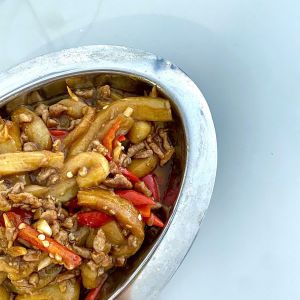 瘦肉切丁,用生粉,料酒,盐腌制一会,茄子切条状备用