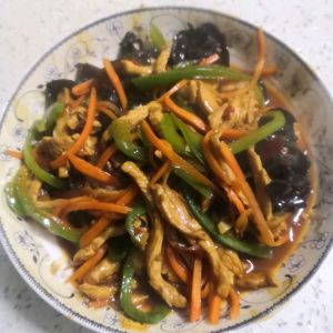 胡萝卜切丝,青椒切丝,泡发木耳撕小片。