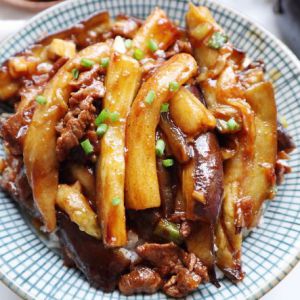 最后倒入茄子翻炒大火收汁,沿锅边淋一点香醋,再撒一点蒜末翻炒均匀即可。