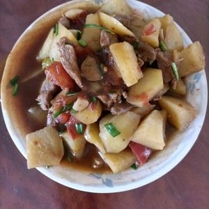 重新开火倒油,油热后,把葱姜蒜倒入爆炒,把冰糖倒入锅中化开,把焯好的肉倒入锅中上色,倒入生抽,盐,翻炒,加入5个八角。把土豆,西红柿加入锅中,转至中火慢慢炖。快出锅时加入两勺鸡精,小葱花调味。