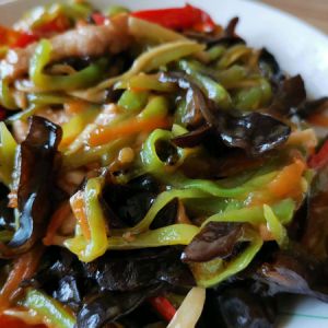 锅烧热,加入少量植物油,热后倒入肉丝和红椒、姜片翻炒,再分别放入胡萝卜丝、高笋丝、莴笋丝、木耳丝,中火翻炒,加入调好的鱼香汁翻炒均匀。
