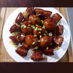 这是用卤蛋和鸡腿肉做的:红烧卤蛋鸡腿肉