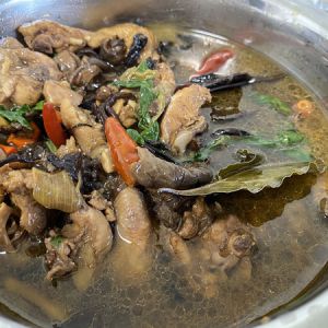 10分钟左右时 最初炖鸡的水已经消耗一部分了,将榛蘑水倒入,继续抹过鸡,大火烧开,调中火继续煮