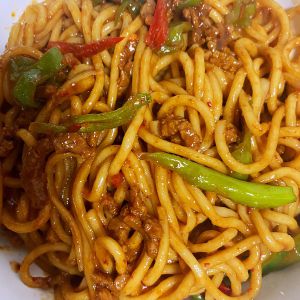 放入之前炒好的牛肉丝,加入一勺孜然粉、一勺辣椒粉翻炒均匀,先关火备用;