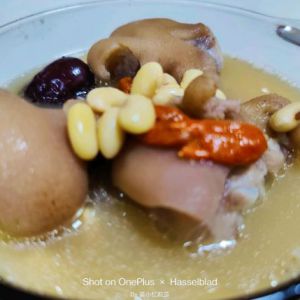 砂锅放入黄豆,姜片,焯水洗净猪脚,蜜饯,红枣,倒入净水炖煮,一次性加足量的水,中途不加水;