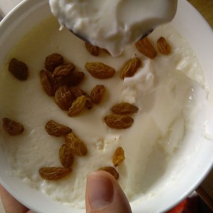 撒上葡萄干可以热着吃,也可以放冰箱冷藏后吃。