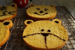 将模具放入预热好的烤箱中下层,以上下火170度,烘烤35-40分钟即可(模具放进烤箱后再模具上面放一个比较重的模具,防止烘烤过程中顶出盖)烘烤完毕后取出立即脱模晾凉。再进行涂鸦。