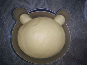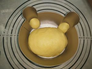 将小面团滚圆放入小熊耳朵位置,再将大的面团放中间位置,放温暖处进行二次发酵。