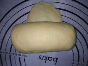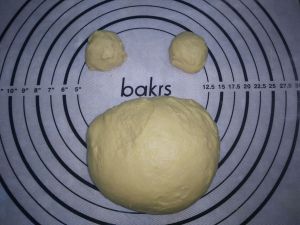 将面团进行排气,将面团称出两个分量为25克一个面团做小熊耳朵,剩下的面团做小熊的头,盖上保鲜膜松弛15分钟。