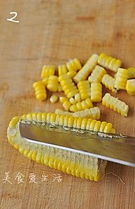 稍凉后,把甜玉米取出,用刀贴着玉米芯子取下玉米粒。