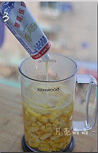 取下的玉米粒放入食物搅拌机中,把刚才煮玉米的水倒入,水量至少要和玉米粒的体积等量(比如一碗玉米粒+ 一碗煮玉米的水)。