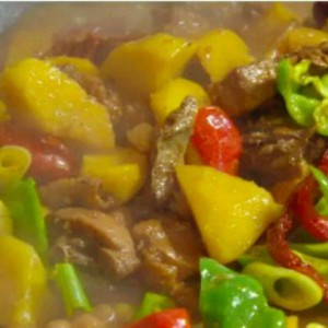 放入土豆块,小火煮至土豆熟。放入青红辣椒,稍微翻炒后,出锅。