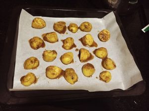 烤盘垫上烘焙纸,放好马铃薯,用230度烤20~40分钟,具体看个头大小