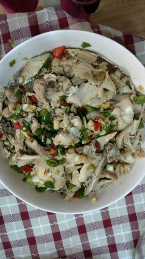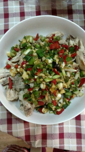 将鸡腿捞出放置干净的板上切块,浇上我们调制的汤汁,拌匀~这样鲜嫩的白斩鸡就完成啦哈哈哈