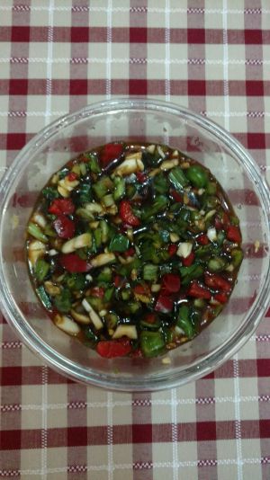 鸡腿炖的同时,我们进行下一步。把青椒红椒切碎,蒜末,葱,生姜末等放入碗里,加入蚝油(我是加的蒸鱼专门用的酱油,颜色淡而且特别香),糖,盐。锅里鸡腿的汤汁也可以浇上少许。这样酱料就ok啦~