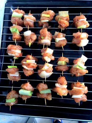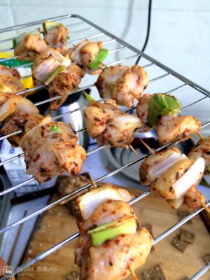 首先将鸡肉用盐、孜然、胡椒粉、少量糖、鸡精、辣椒粉,味30分钟味的时候加入一个鸡蛋保证嫩滑。然后在将葱切段或者随意切,用牙签穿好鸡肉和葱段