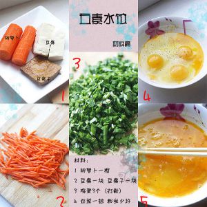 鸡蛋炒熟后放凉,加入碾碎的豆腐,加入胡萝卜碎,豆腐干碎搅拌均匀。