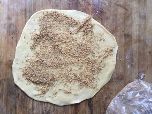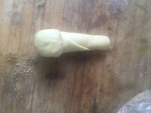 3,取适量面团,擀成薄饼。