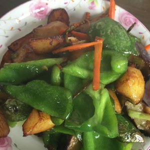 留底油,放蒜姜葱,然后再把炸好的土豆、茄子,放入青椒翻炒。最后调味出锅
