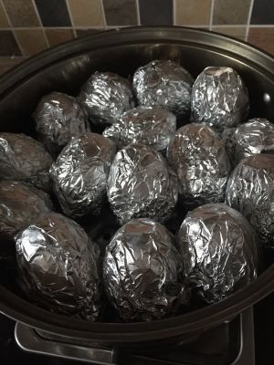 因为弄蛋的时候手潮的所以没有拍照!鸭蛋小的一头轻轻敲击,然后把蛋白倒出,全部倒出后就把刚搅拌好的食材装进去,装到9分满就可以啦!