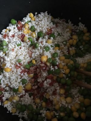 糯米泡了一个晚上后 把多余的水去掉!然后把切碎的腊肠和青豆,玉米一起放里面搅拌!然后加入生抽老抽,可以按自己的口味加多或者放少点!