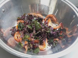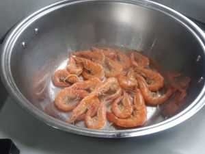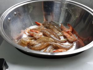 锅加油,放入姜丝,煸香后放入处理好的虾,待虾熟透。虾去虾脑,虾线,虾枪等,并在虾背上切开,这样可以更好的入味,吃起来也比较方便