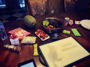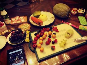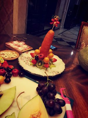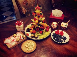 我觉得哈密瓜切片做树底挺好。不过我还是建议大家切片水果少用,没人马上吃就浪费了,五十元1kg的杨桃和猕猴桃,吃完晚饭回来一棵树没几个人动,切片的都扔了,个人认为挺浪费的。我没撒糖霜做雪也是觉得不易保存外加糖份过高。