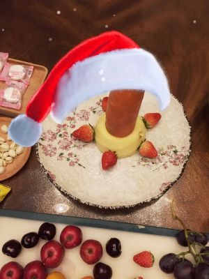 家里没有奶油了,直接拿圣诞老人杯子倒满酸奶,可沾水果吃。(算是我给原菜单改良了哈哈