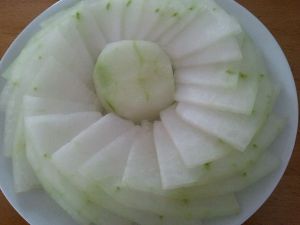 冬瓜去皮切薄片,取一盘子、将冬瓜片摆成柳叶状。
