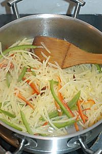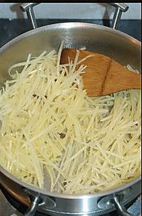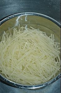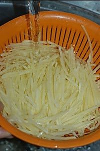 把土豆絲浸泡再淡鹽水中至少20分鐘,然後撈出瀝乾水份備用。