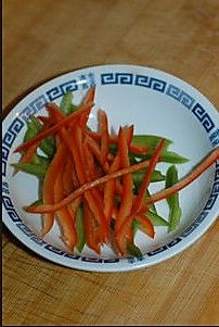 放入青紅椒絲快速煸炒片刻后,調入少量鹽和雞精即可出鍋。
