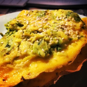 在锅中均匀铺开西葫芦丝,倒入鸡蛋液和柠檬皮屑