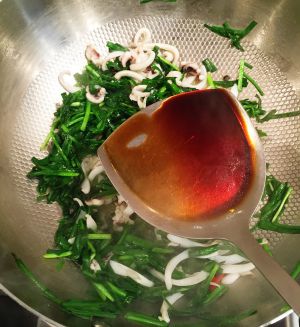 倒入墨鱼仔翻炒几下后,加一勺生抽,墨鱼仔炒熟即可装盘,记得动作要快哦