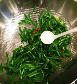 因为墨鱼仔本身有些咸味,所以炒韭菜时要加一勺盐翻炒