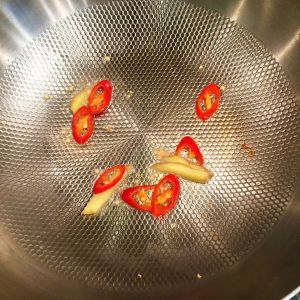 炒锅入油,热锅后入姜片和红椒爆香,倒入韭菜翻炒