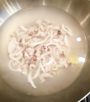 锅内入清水烧开,将墨鱼仔在沸水中快速的焯水后用漏勺舀出