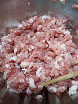 肉馅适宜用7·8瘦3·2肥的,太瘦了柴太肥了油腻。肉馅放盐、鸡精、白胡椒粉、葱末、姜末和料酒搅拌均匀,分多次进行打水。放入马蹄碎和鸡蛋清向一个方向搅打上劲儿。