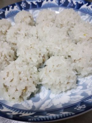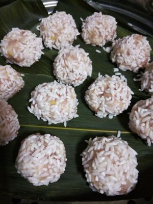 蒸屉上火,粽叶垫入蒸屉。用手搓出丸子并沾上糯米置于粽叶上。
