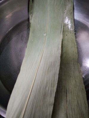 粽子叶不用泡水直接放入冷水锅加热,水开后煮十分钟,使之回软并消毒。