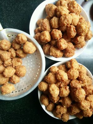 锅里倒油,筷子插油锅里有气泡油温就可以下丸子了,炸到七八分熟捞起来,再大火升高油温复炸,也可以偷懒直接一遍炸好。