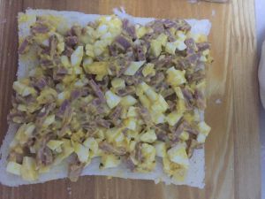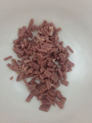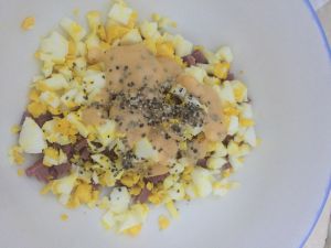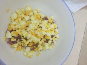 鸡蛋碎和火腿碎放入一起,加一勺蛋黄酱或者千岛酱,黑胡椒碎少许